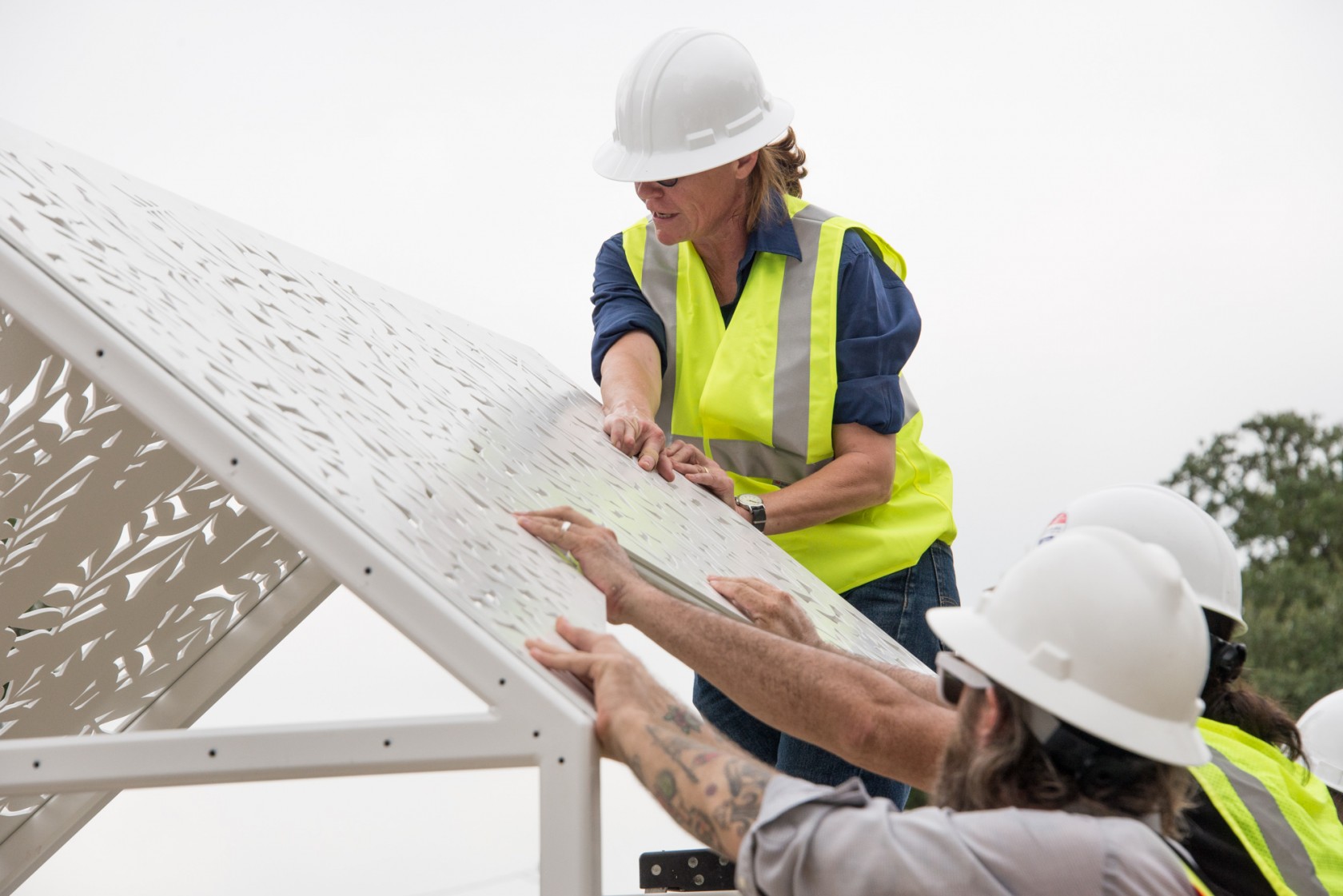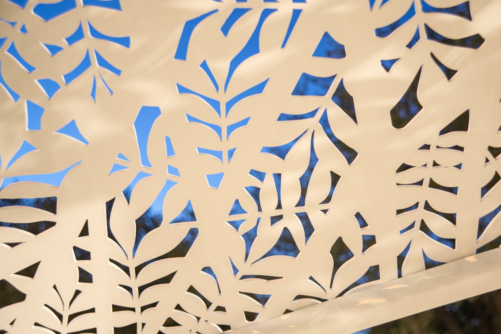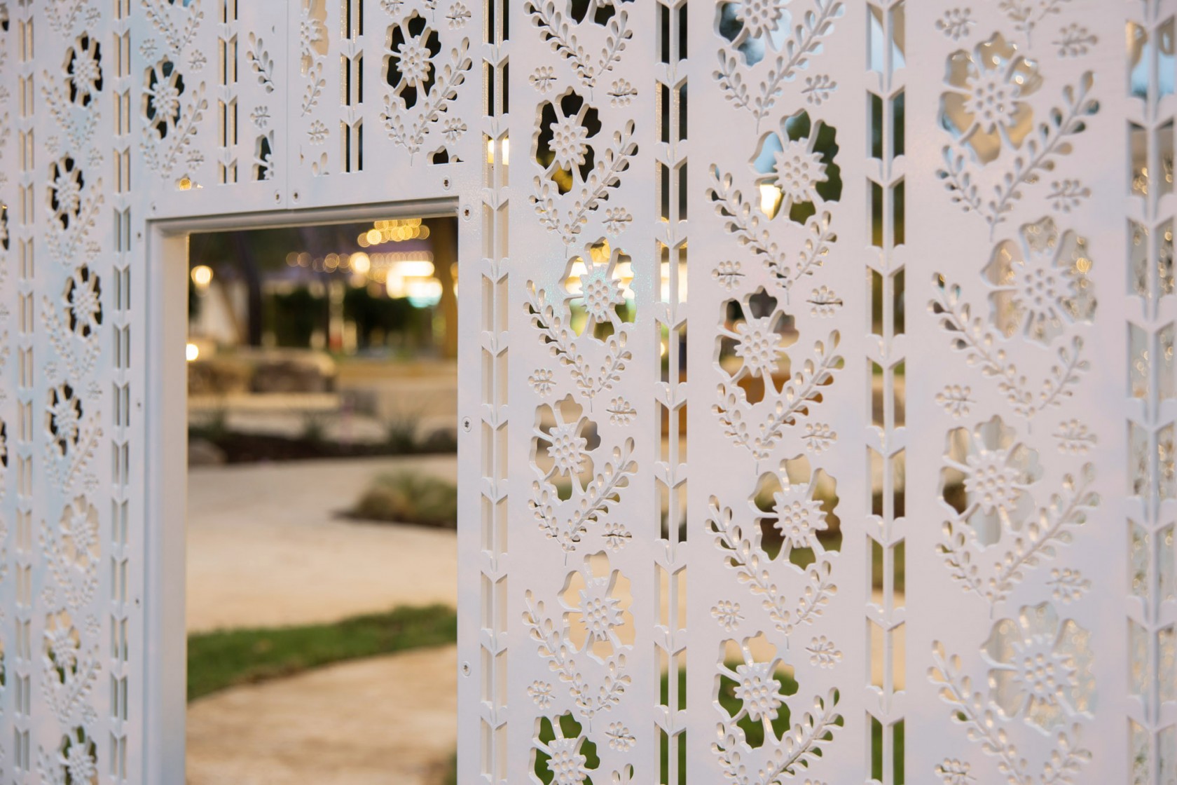 Steel wall panels are perforated with laser cut period wallpaper patterns while roof panels mimic large shady pecan trees. A scaled floor plan is etched into the concrete slab. A poem, etched onto the concrete walkway, speaks to how a house can reside in our memories. The poem is organized so it can be read backwards (starting with a question “who lived there”) as one approaches the house, or forwards (with the statement “a house remains”).