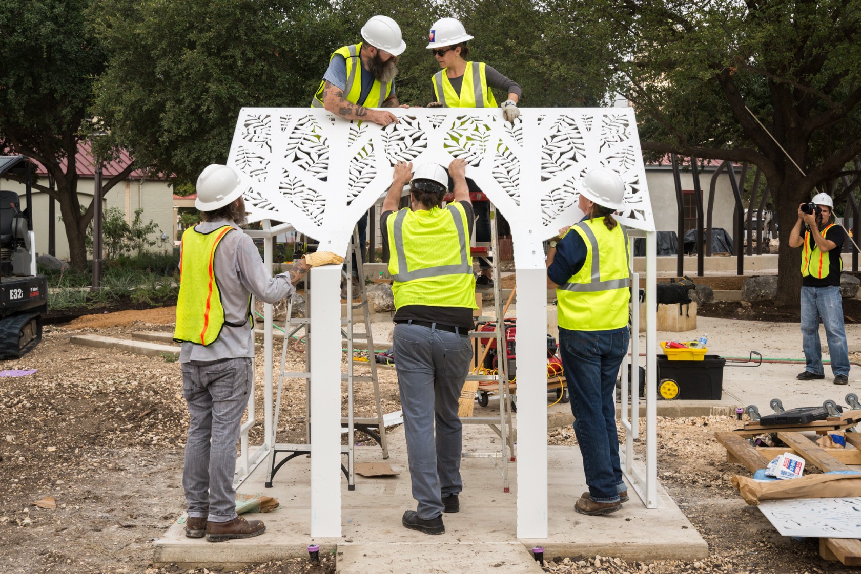 PLAYhouse is a shade structure inspired by the neighborhood that existed before Hemisfair, where “saltbox style” houses once stood on the project site. This playfully scaled down structure honors the overall proportions and style of the original houses and creates a space of pretend.