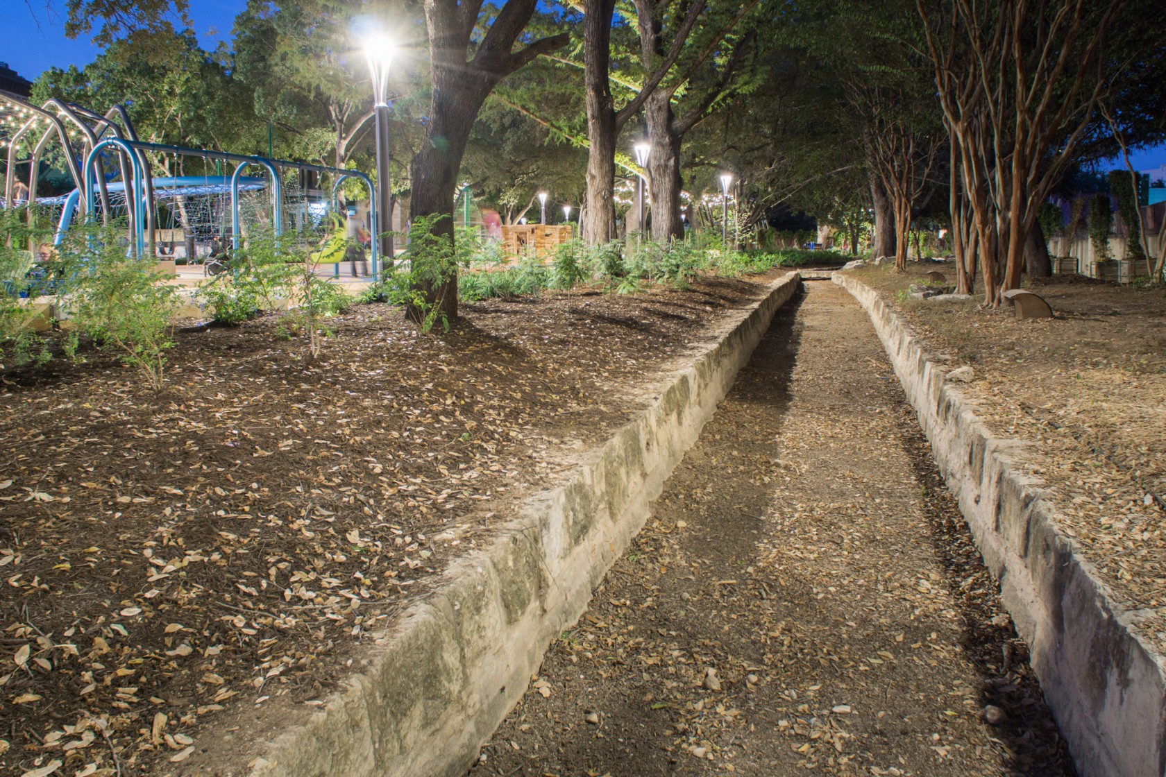 Familiar sounds like children’s laughter, birdsong and car noise are variously abstracted then reassembled into new sounds. All weather speakers are mounted along the park’s historic acequia, from which processed sounds allow a progression of discovery. Each sound’s relationship to the next, and to the space as a whole, has been considered to draw visitors’ attention to the act of listening. Through this renewed focus, patrons begin to hear all of the naturally occurring sounds around them. This awareness leads to curiosity about why a particular sound is different here than over there, drawing the listener down the acequia to investigate more of the park.