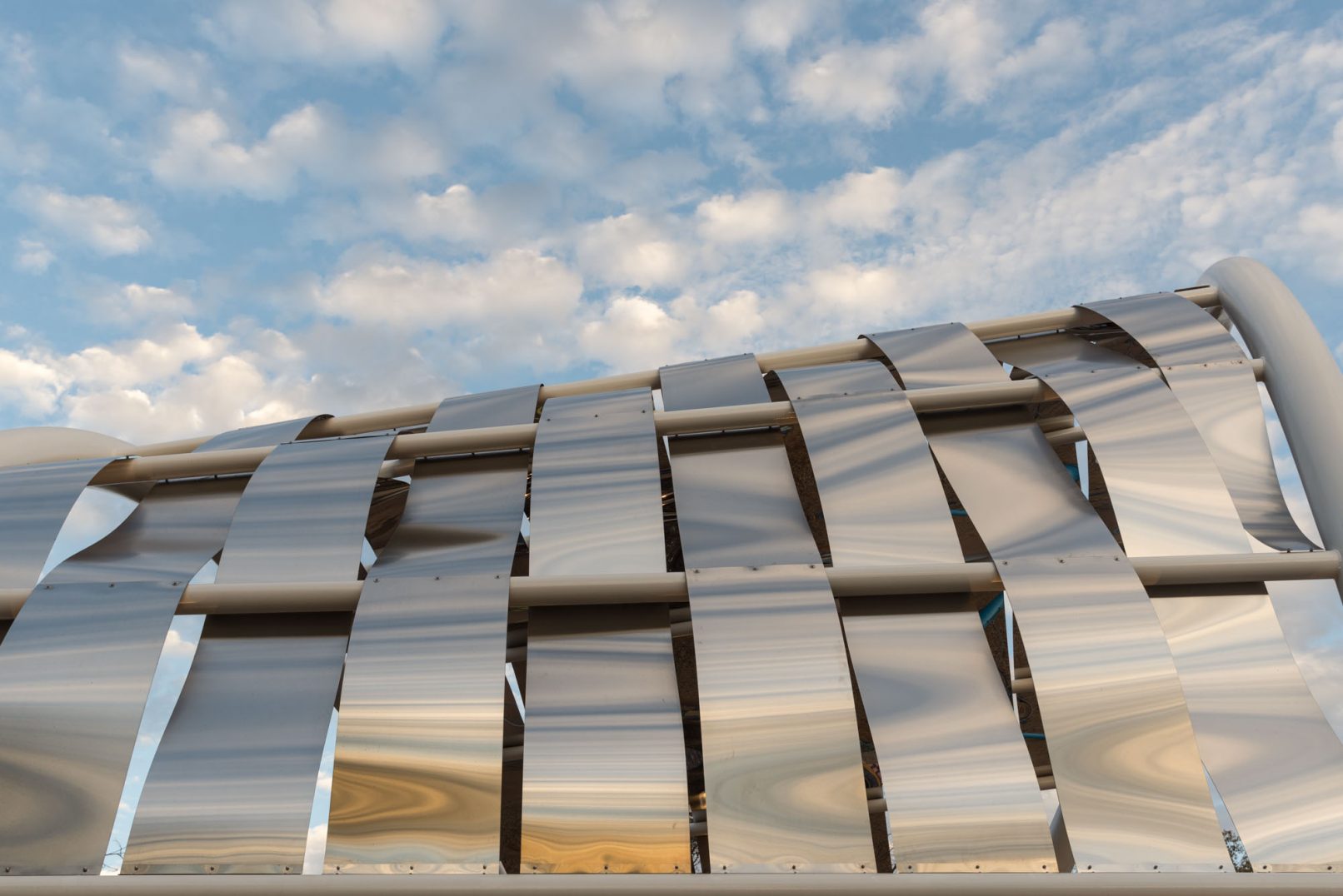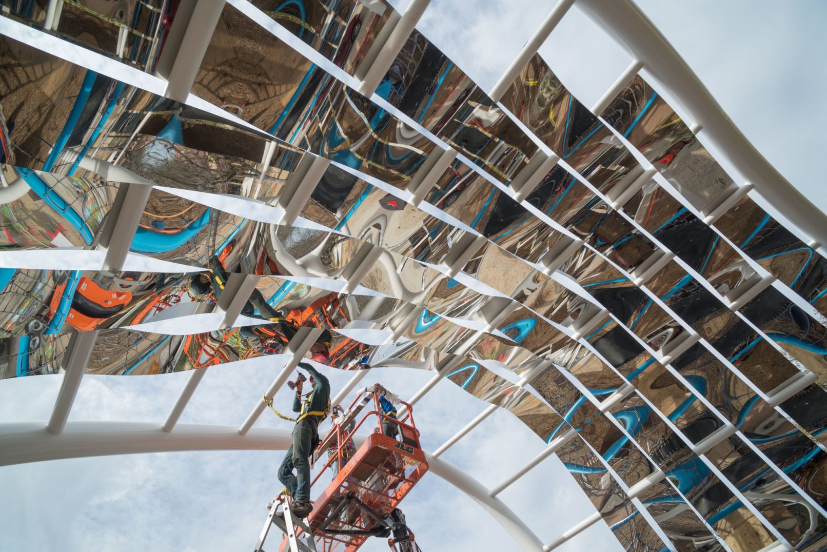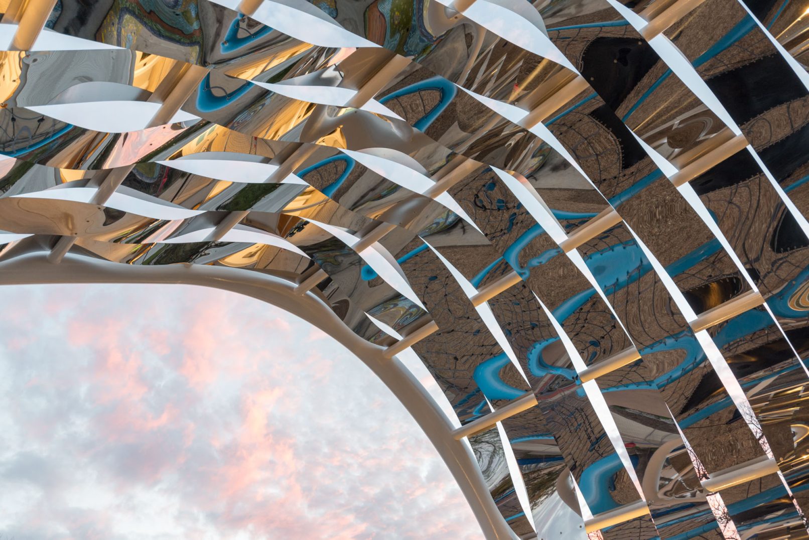 The stainless-steel ribbons mirror finish reflect and refract the surrounding landscape, buildings and, most importantly, the children and adults utilizing the playground. The arrangement of the sculpture creates a dappled shadow effect over the playground that changes with the movement of the sun.